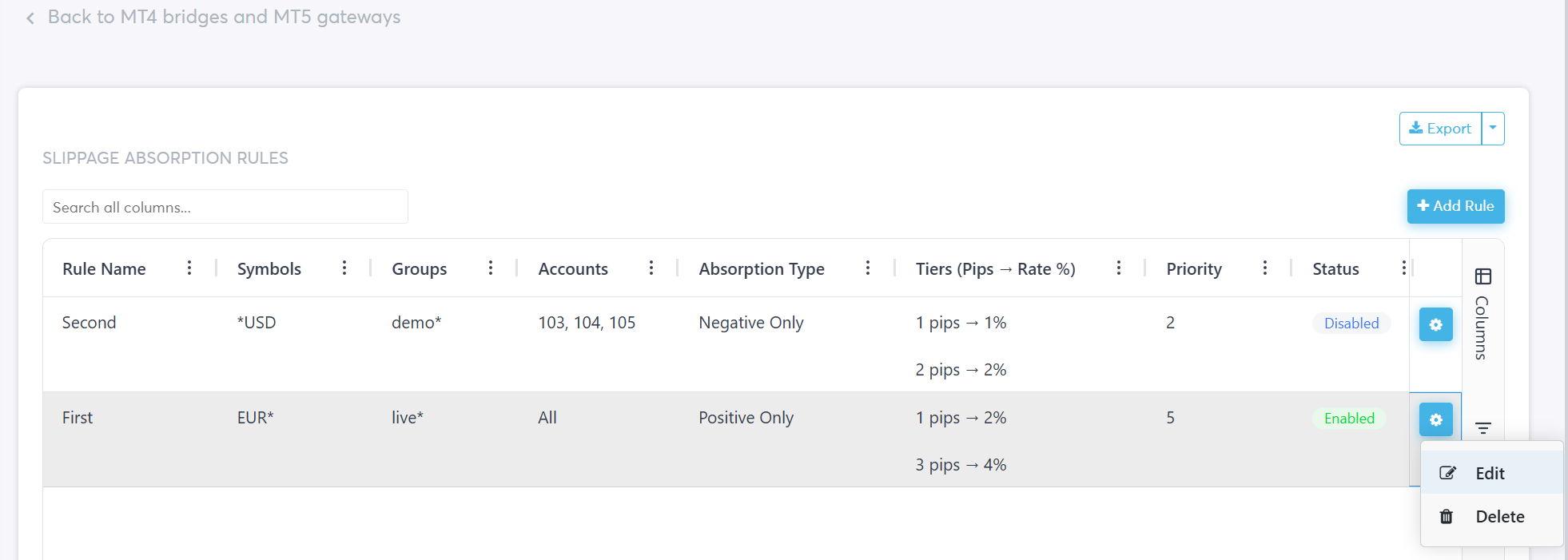 - We have implemented a new UI and API for managing slippage absorption rules in MT4 Bridge and MT5 Gateway. Users can now view, create, edit, delete, and import/export slippage absorption rules directly from the Cloud portal. Each rule supports multiple tiers, with configurable slippage pips and absorption rate percentages, and filtering by symbols, groups, and accounts.