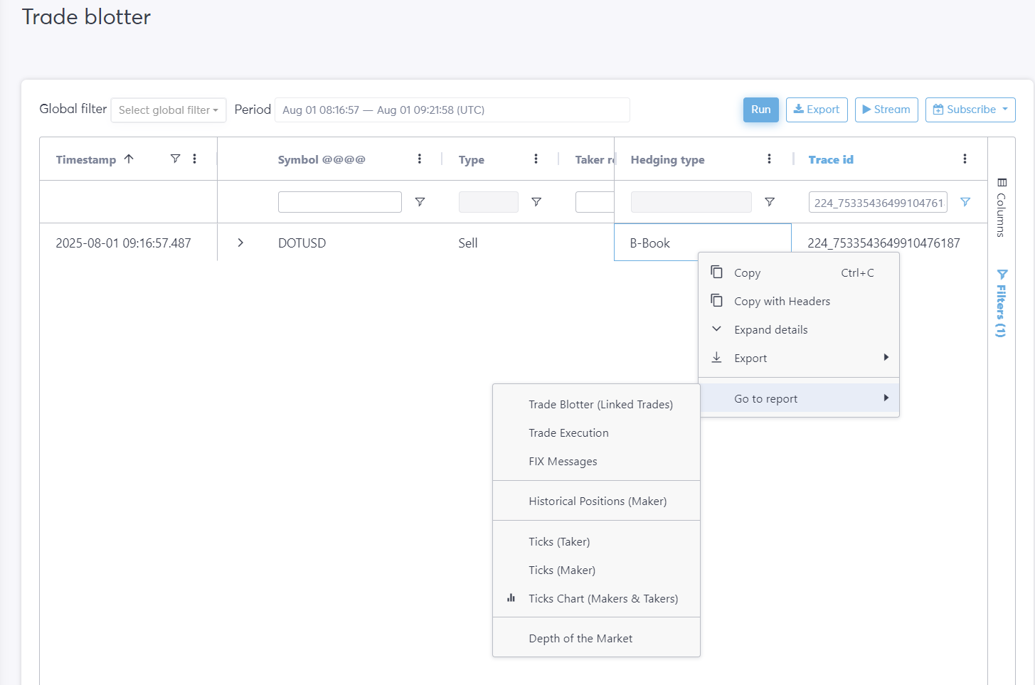 To access Trade Blotter, go to Monitoring> Trade Blotter (BETA) in the main menu. You can also find more information about the report in our User guide.