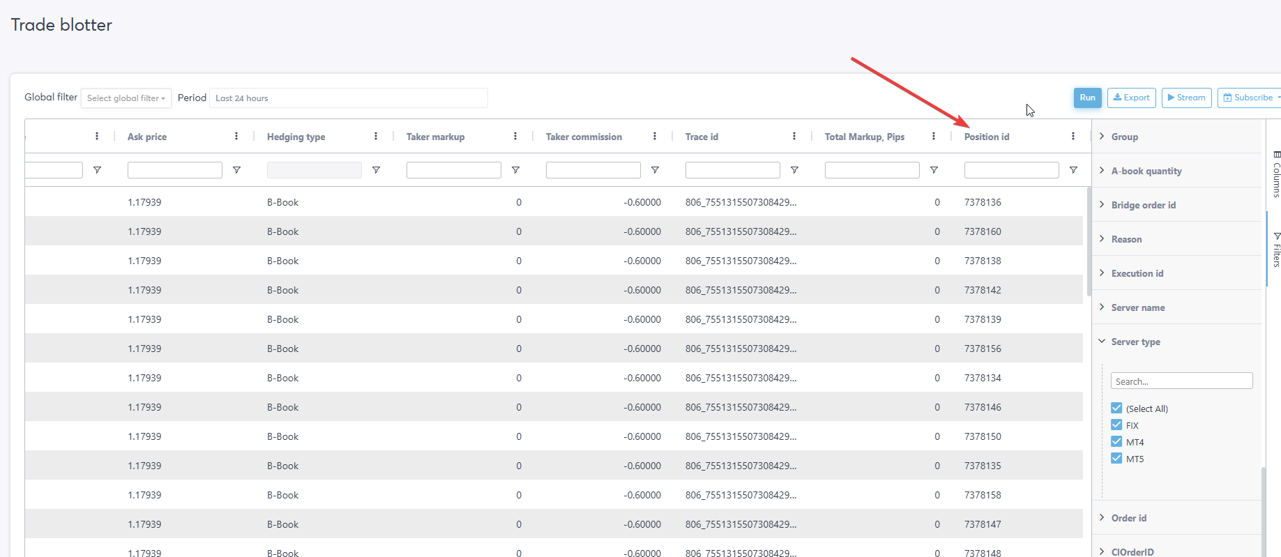 • We added Position Id to the Trade Blotter report. The field is populated for MT5 deals. FIX Server has an empty value.