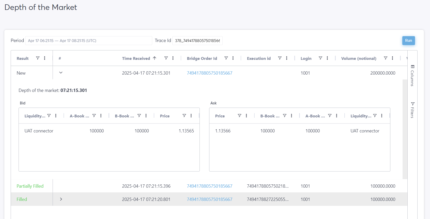 • The report shows all available Bid/Ask price layers for each order execution, including New, Rejected, Cancelled, Partially Filled, and Filled orders.
